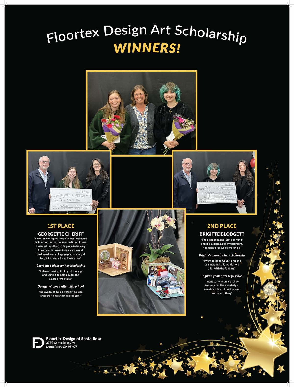 Santa Rosa High School students Georgette Cheriff and Brigitte Blodgett were awarded college and art school scholarships from a local company, Floortex Design of Santa Rosa. First-place winner, Georgette Cheriff (15 years old), received $1,000 for her diorama, titled “Textures of Home.” A surprise runner-up prize of $250 was awarded to 17-year-old Brigitte Blodgett.